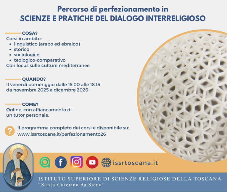 Sono aperte le iscrizioni al percorso formativo di perfezionamento in scienze e pratiche del dialogo interreligioso. Clicca qui per informazioni e iscrizione