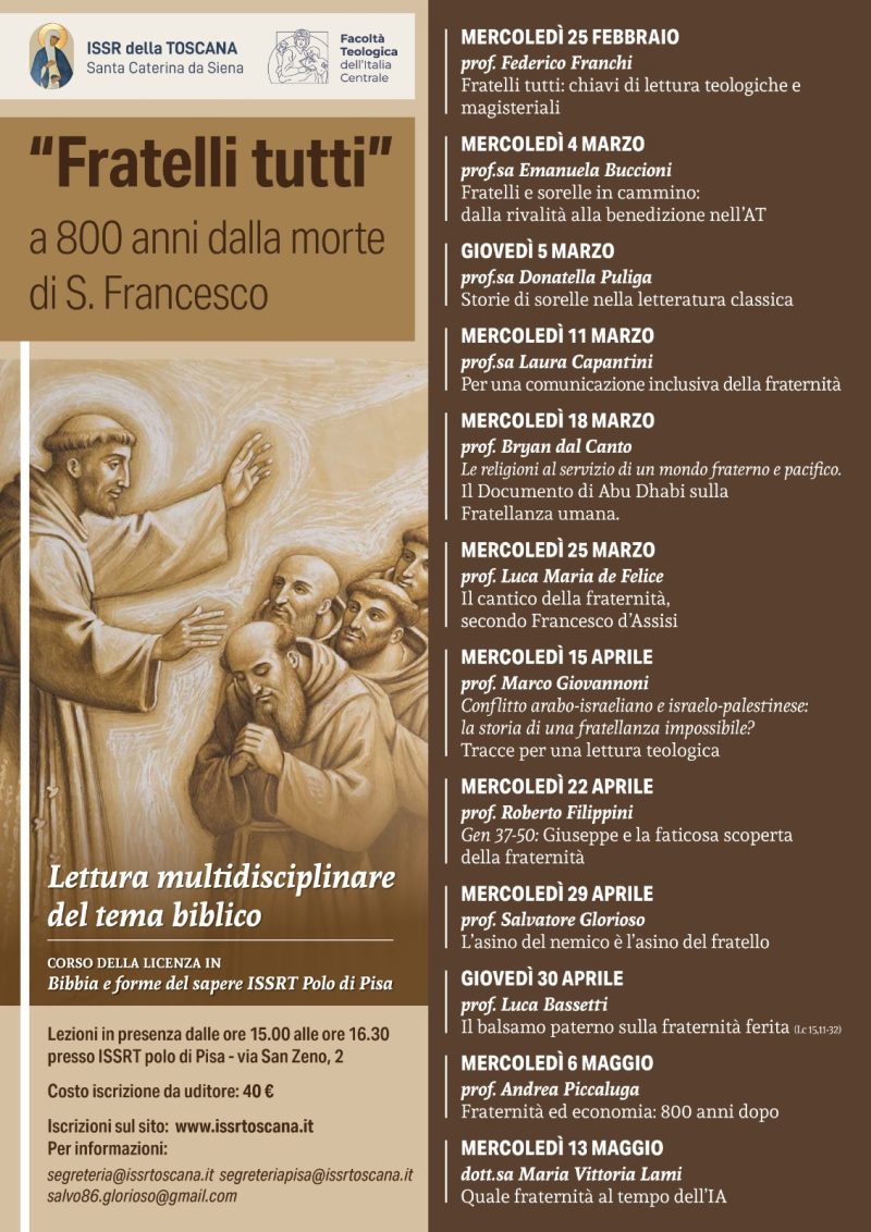 Il polo di Pisa dell’Istituto superiore di scienze religiose della Toscana propone il ciclo di lezioni «”Fratelli tutti” a 800 anni dalla morte di san Francesco», lettura multidisciplinare del tema della fraternità. Al corso – che è valido per il conseguimento della licenza in Bibbia e forme del sapere – possono partecipare tutti, anche da semplici uditori (per iscrizioni www.issrtoscana.it, per gli uditori è richiesta una iscrizione di 40 euro). La prima lezione sarà tenuta mercoledi 25 febbraio (ore 15-16.30, nella sede del polo di Pisa dell’Issrt, in via San Zeno 2)